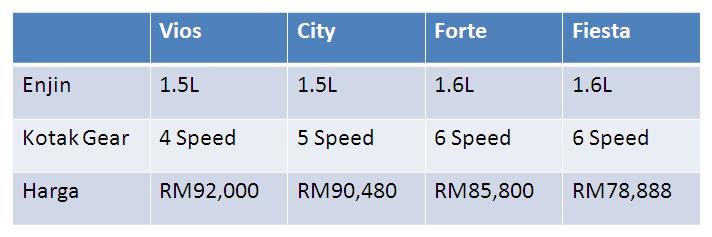 Mengambil kira varian tertinggi model sedan untuk Vios, City, Forte, 207 dan Fiesta, sembang-auto membuat perbandingan dari segi harga dan powertrain yang ditawarkan oleh kesemua model yang disebutkan di atas.