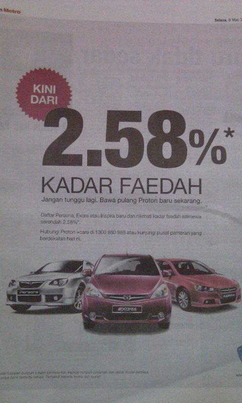 Tadi sewaktu admin membaca akhbar Harian Metro, admin ternampak iklan satu muka Proton yang menawarkan pembiayaan serendah dari 2.58% untuk model Persona, Exora dan Inspira. Sebelum ini Proton membuat tawaran untuk model Inspira dan Exora sahaja pada kadar 2.88% namun seteru mereka iaitu Perodua yang memberi rebat tunai untuk 3 model utama mereka memaksa Proton untuk menambah model dan tawaran mereka. Perang harga? Mungkin. Untuk makluman pembaca, kadar pembiayaan pada ketika ini ialah 3.75% hingga 4.1% justeru tawaran ini adalah begitu berbaloi untuk mengurangkan komitmen bulanan untuk sebuah kereta baru. Inilah masanya untuk anda memiliki kereta Proton idaman anda.