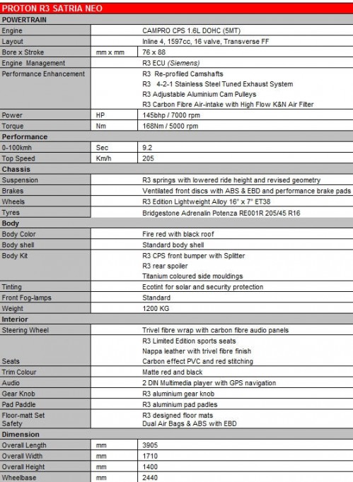 Proton hari ini telah melancarkan model Satria Neo R3 talaan bahagian sukan permotoran mereka iaitu Race, Rally and Research atau R3. Seperti beberapa gambar Spy Shots terdahulu, model ini hanya ditawarkan dengan 1 warna sahaja iaitu merah api dengan bodykit model CPS ditambahkan dengan beberapa komponen baru seperti spoiler bumbung R3, front lip, door protector berwarna titanium dan ianya juga adalah 10mm lebih rendah.